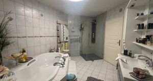 Erdgeschoß: 2 x WC, Dusche mit Waschbecken und WC, Bad mit Wanne, Dusche, WC, insgesamt helle Ausstattung, aus den Jahren 1994 und 1998