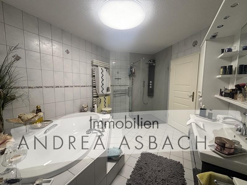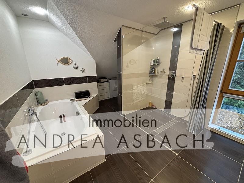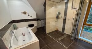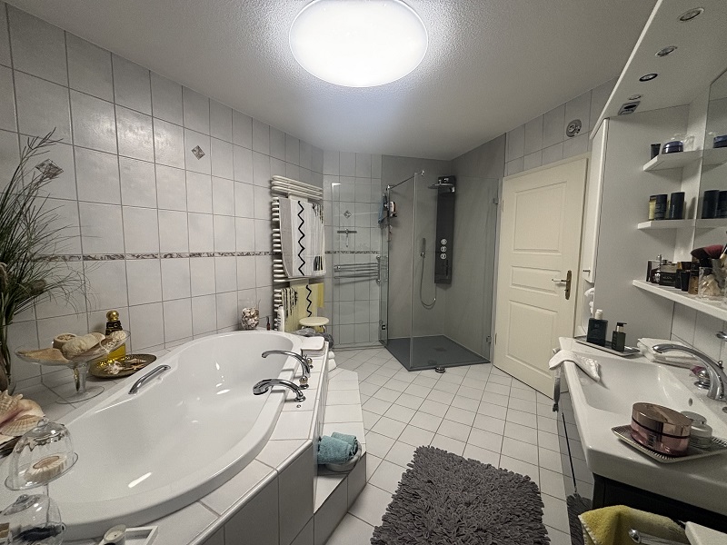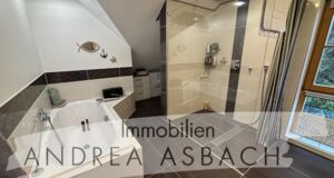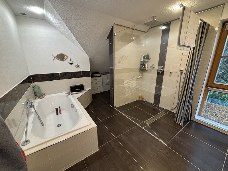 Dachgeschoß: barrierefreie Dusche, Badewanne, WC, Doppelwaschbecken, Gäste-WC mit Dusche, Ausstattung braun/weiß aus dem Jahr 2011